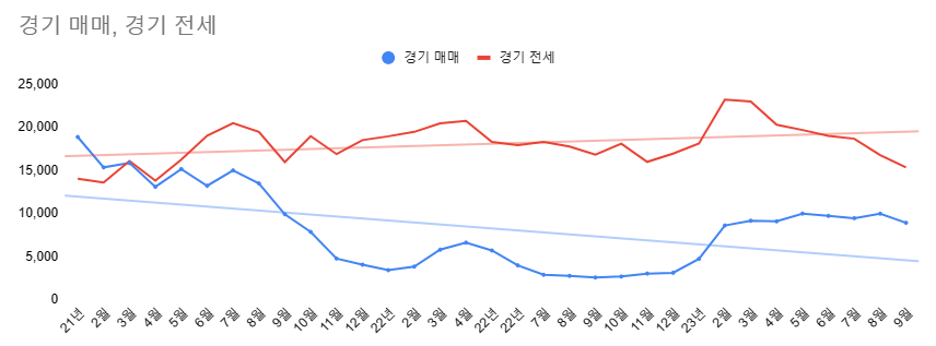 - 경기의 월세 비중이 확 늘어난 것도 특이점이지만, 전세 거래건수가 올해 3월 이후 지속적으로 하락하고 있다는 것도 특이점입니다.