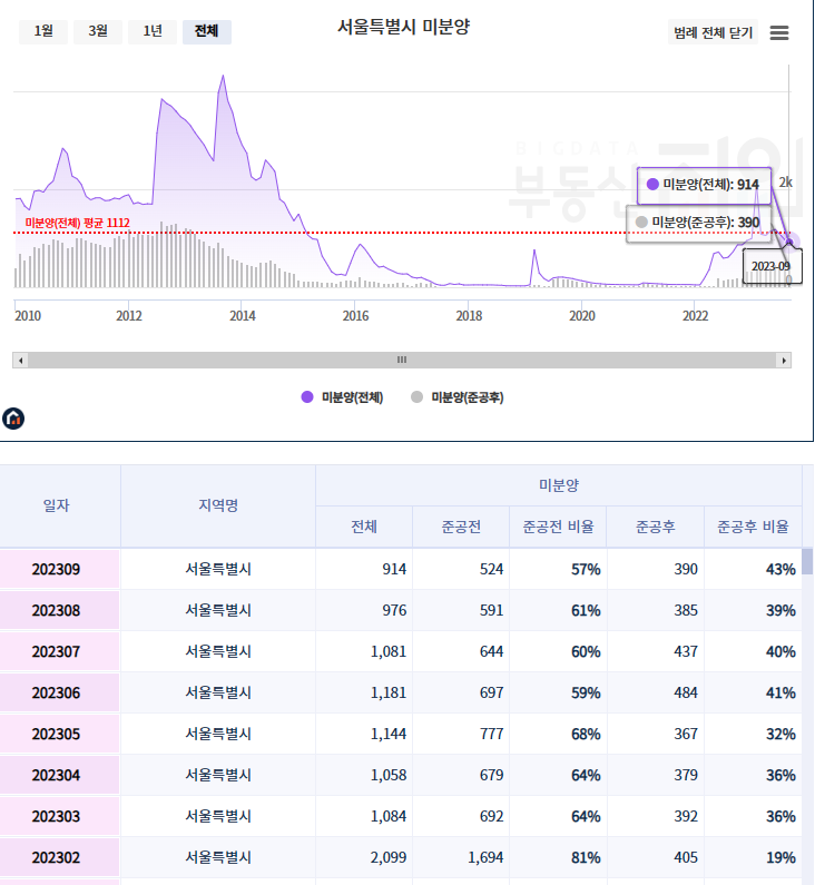 서울시는 미분양 지수 자체가 크지는 않은듯 한데, 준공후 비율이 획기적으로 달라지지도 않는 것 같네요. 그래도 서울이라도 이렇게 수치가 많지 않아서 다행입니다.