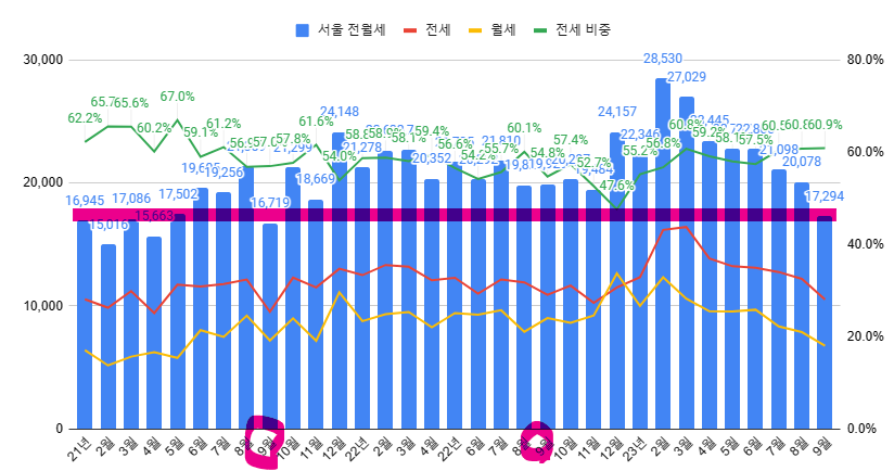 - 우선, 절대적인 전월세 거래 건수 자체가 줄어들었습니다. 매매거래 자체가 엄청 줄었던 작년 9월보다는 확연히 줄었지만, 21년 9월보다는 그래도 늘어난 수치입니다. 아무래도 추석 전에는 비수기인듯 하죠?