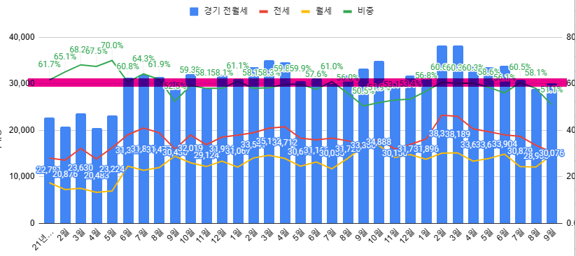 - 지속적인 전세사기 뉴스 때문이었을까요? 전세 비중은 줄어들고 월세 비중이 확 늘어난 특징이 보이네요. 그러다 보니 9월 전세 비중은 51.1%로 급감했습니다.