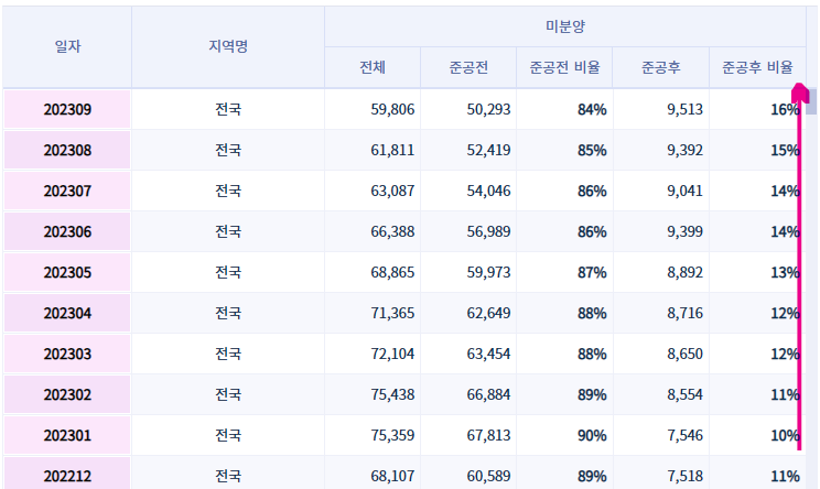 다만 보시는 바와 같이, 준공후 미분양 즉, 악성 미분양은 지속 증가세입니다. 많은 분들께서 아시다시피, 요즘에 후분양을 하기 때문에 준공전 미분양 수치는 떨어질수 밖에 없는거 아닌가 생각을 해 봅니다.