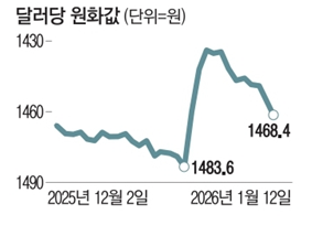 - 원화값 7거래일 연속 하락, 다시 1460원대로 주저앉아