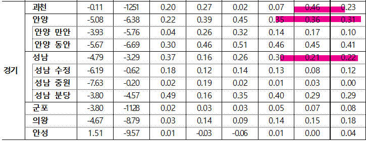 - 광주시(-0.10%)는 곤지암·초월읍 위주로, 동두천시(-0.09%)는 생연·지행동 위주로 하락했으나, 안양 동안구(0.22%)는 비산·호계동 위주로, 하남시(0.18%)는 선·학암동 준신축 위주로, 수원 영통구(0.17%)는 매탄·원천동 주요단지 위주로, 수원 팔달구(0.15%)는 우만·화서동 중소형 평형 위주로, 성남 분당구(0.12%)는 교통환경 양호한 금곡·이매동 위주로 상승