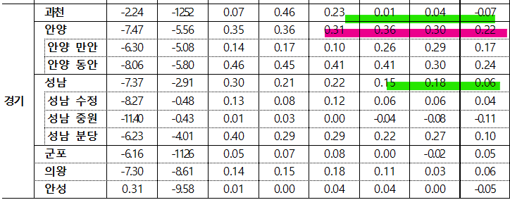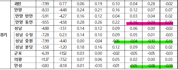 아직 상승을 하고 있는 곳도 몇군데 보이네요, 아무래도 재개발이나 호재가 있는 곳으로 보여집니다.