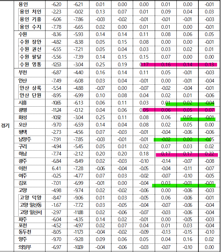 - 하남시(0.22%)는 감이‧망월동 위주로, 수원 영통구(0.13%)는 이의‧하‧매탄동 위주로, 안양 동안구(0.09%)는 비산‧평촌동 위주로 상승했으나, 성남 중원구(-0.16%)는 상대원‧은행동 원도심 위주로, 동두천시(-0.10%)는 송내‧생연동 외곽 구축 위주로, 광주시(-0.08%)는 장지‧탄벌동 위주로 하락하는 등 지역별 혼조세를 보이며 경기 전체 보합에서 하락 전환