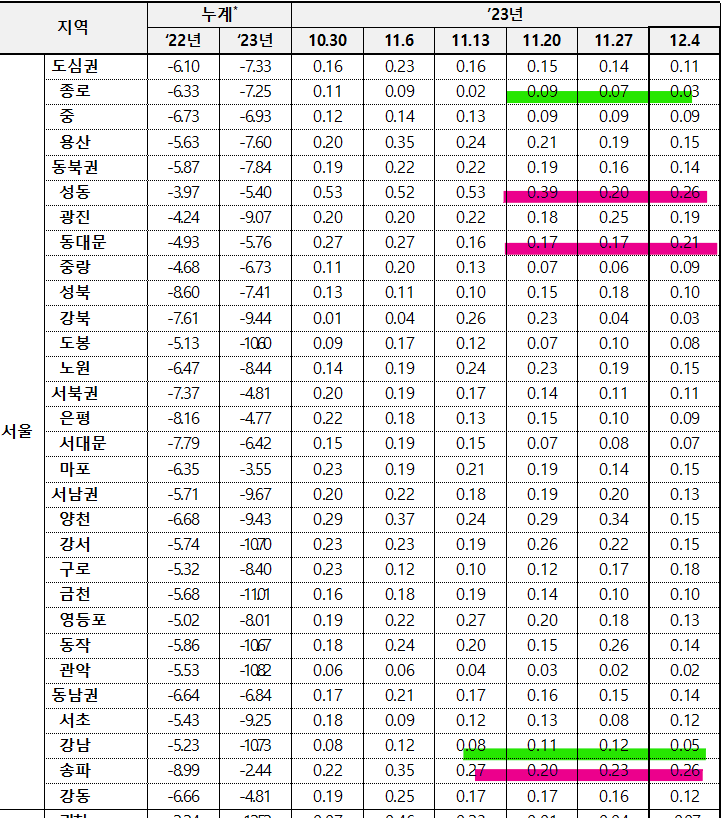강남구는 여전히 하락세입니다. 실제 시장을 봐도 이번주부터 하락 매물이 나오고 있는게 보여지니까요.