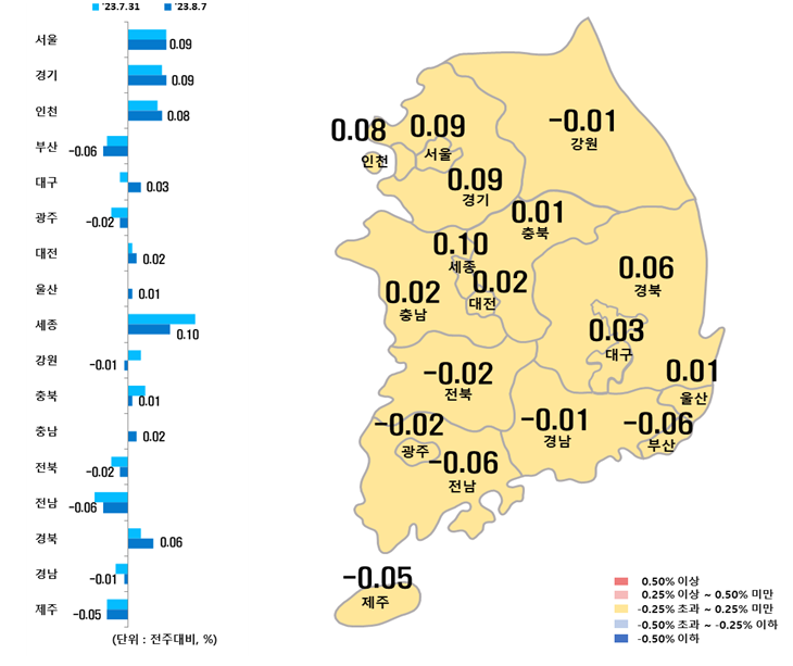 보시는 것 처럼. 전국 평균은 0.04 상승이지만, 이는 수도권이 전체적 상승세이기 때문이고