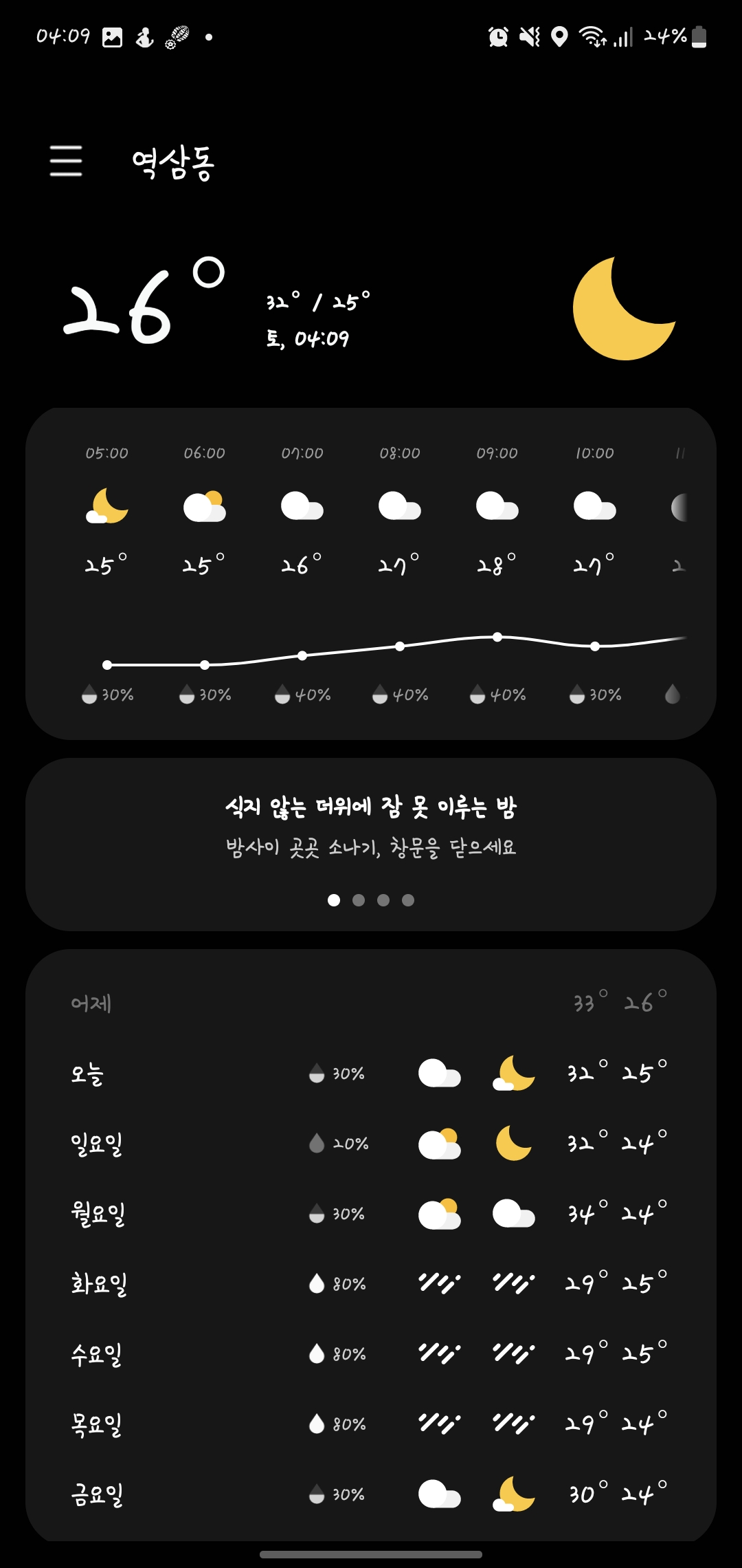 낮엔 상당히 덥고 밤엔 그래도 선선한(?) 날이 계속되고 있네요..