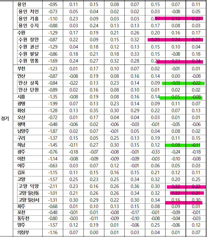 - 고양 일산서구(0.30%)는 대화·탄현동 위주로, 수원 영통구(0.24%)는 영통·망포동 주요단지 위주로, 고양 덕양구(0.23%)는 화정·행신동 위주로, 용인 기흥구(0.23%)는 신갈·상갈동 중소형 규모 위주로, 수원 장안구(0.22%)는 정주여건 양호한 정자·천천동 위주로, 고양 일산동구(0.21%)는 식사·백석동 대단지 위주로 상승