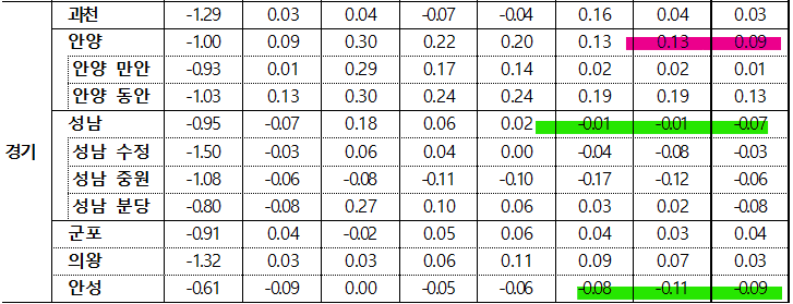 - 과천시(0.02%)는 정주여건 양호한 부림‧중앙동 주요단지 위주로 상승했으나, 안산 상록구(-0.29%)는 성포‧본오동 대단지 위주로, 광주시(-0.27%)는 태전동‧초월읍 위주로, 하남시(-0.24%)는 덕풍‧창우동 위주로, 성남 중원구(-0.16%)는 금광‧하대원‧은행동 위주로, 수원 장안구(-0.15%)는 조원‧정자동 위주로 하락