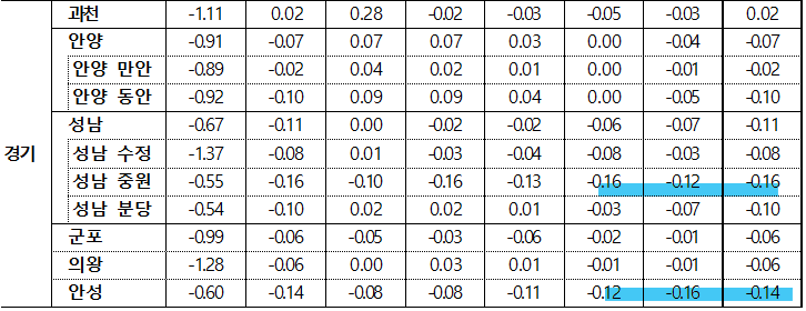 - 과천시(0.02%)는 정주여건 양호한 부림‧중앙동 주요단지 위주로 상승했으나, 안산 상록구(-0.29%)는 성포‧본오동 대단지 위주로, 광주시(-0.27%)는 태전동‧초월읍 위주로, 하남시(-0.24%)는 덕풍‧창우동 위주로, 성남 중원구(-0.16%)는 금광‧하대원‧은행동 위주로, 수원 장안구(-0.15%)는 조원‧정자동 위주로 하락