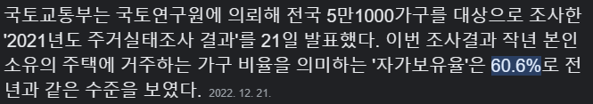 아무리 "서민"들이 집을 못산다고 하더라도, 자가 보유율은 60%정도 입니다.