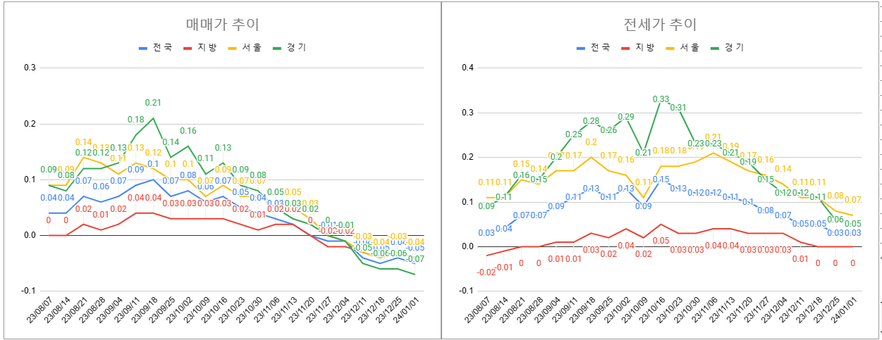 보시는건, 서울 수도권을 포함한 전국의 매매, 전세가 추이입니다.