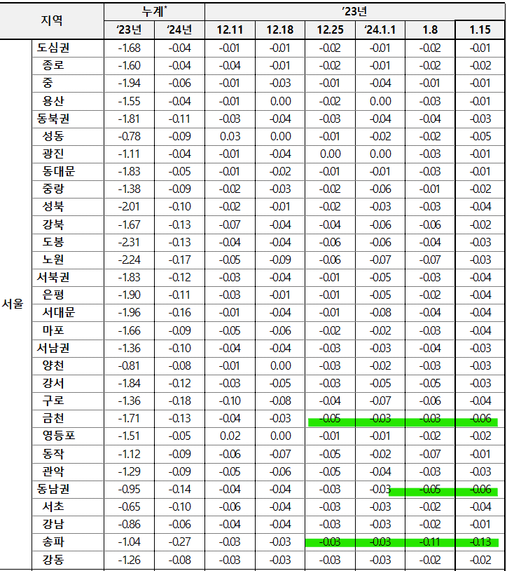 - (강남 11개구 : -0.04%) 송파구(-0.13%)는 가락‧잠실‧문정동 대단지 위주로, 금천구(-0.06%)는 독산‧시흥동 중소형 규모 위주로, 서초구(-0.04%)는 잠원‧반포동 주요단지 위주로, 구로구(-0.04%)는 오류‧개봉동 대단지 위주로 하락