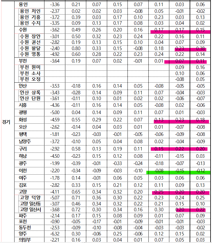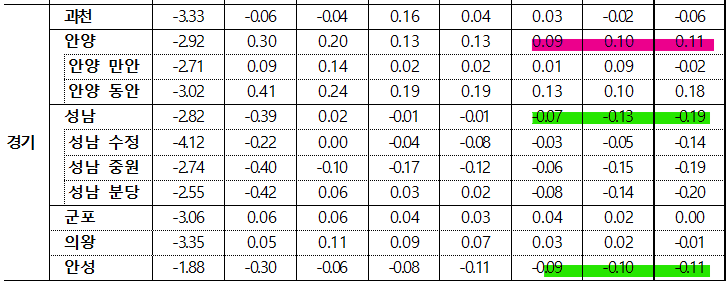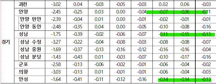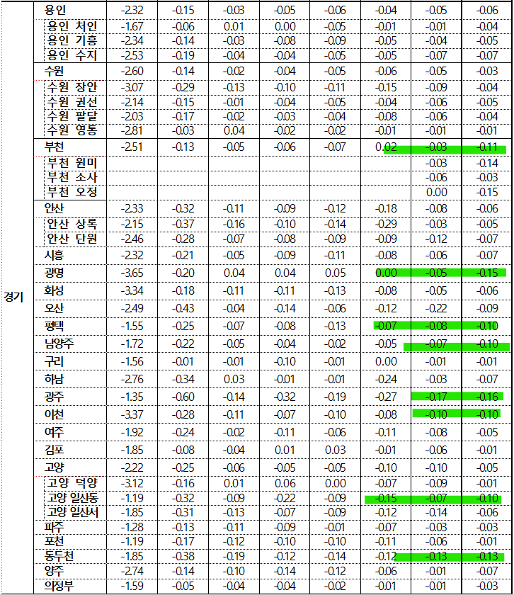 - 광주시(-0.16%)는 경안‧쌍령동 준신축 위주로, 성남 분당구(-0.16%)는 수내‧서현동 구축 위주로, 안양 동안구(-0.16%)는 관양‧평촌동 위주로, 광명시(-0.15%)는 철산‧하안동 대단지 위주로, 부천 오정구(-0.15%)는 오정‧여월‧원종동 위주로, 부천 원미구(-0.14%)는 원미‧상‧약대동 중소형 규모 위주로, 고양 일산동구(-0.10%)는 풍‧장항‧백석동 위주로 하락