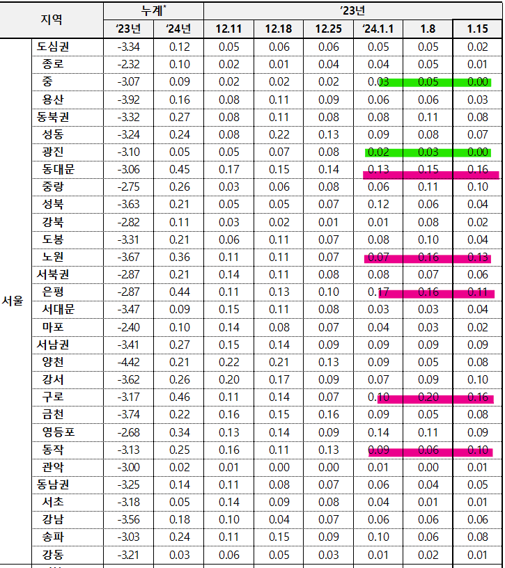 - (강북 14개구 : -0.03%) 성동구(-0.05%)는 금호‧행당‧응봉동 주요단지 위주로, 마포구(-0.04%)는 대흥·염리·창전동 위주로, 서대문구(-0.04%)는 남가좌‧북가좌동 대단지 위주로, 은평구(-0.04%)는 갈현‧불광·신사동 구축 위주로 하락