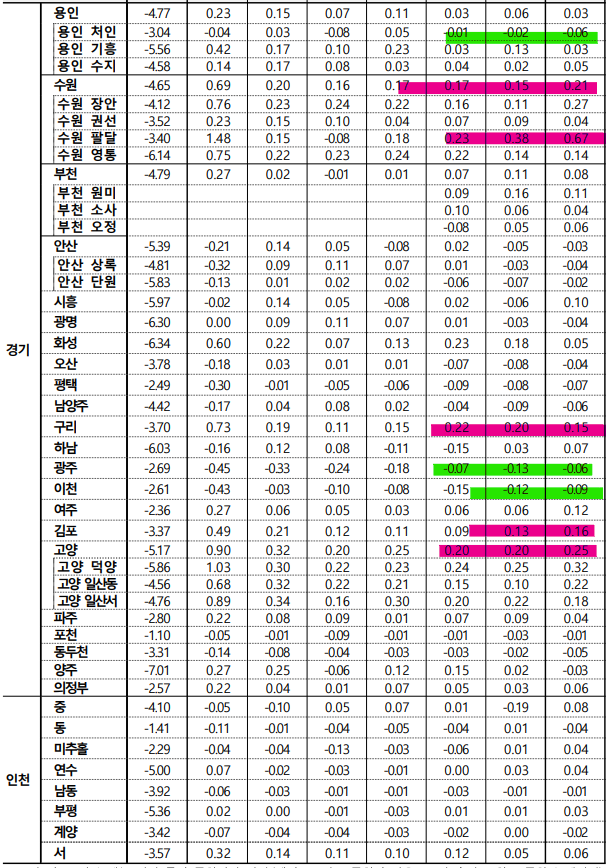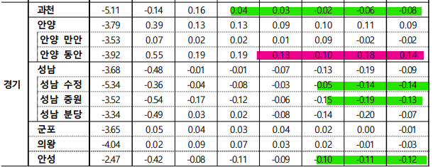- 김포시(0.04%)는 개발호재 영향으로 신축 대단지 위주로 상승하며 상승 전환, 고양 덕양구(0.00%)는 단지별 혼조세 보이며 보합 전환하였으나, 동두천시(-0.17%)는 지행‧생연동 구축 위주로, 광주시(-0.15%)는 태전‧탄벌동 주요단지 위주로, 고양 일산동구(-0.13%)는 식사‧풍동 중대형 규모 위주로, 안양 동안구(-0.13%)는 비산‧평촌동 대단지 위주로 하락