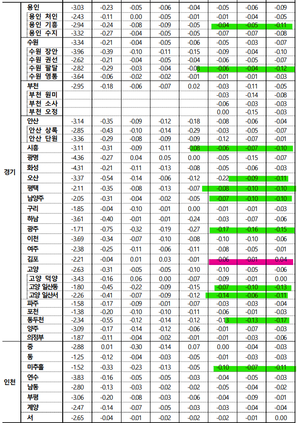 ☞ 0.1% 이상 빠진곳이 꽤 많구만요. 동두천이나 광주등 서울 동북쪽은 하락이 더욱 두드러지는것도 같구요.