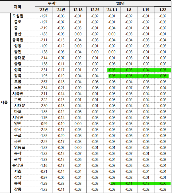 - (강북 14개구 : -0.03%) 성북구(-0.07%)는 정릉‧종암동 위주로, 강북구(-0.06%)는 미아‧번동 대단지 위주로, 도봉구(-0.05%)는 도봉‧창동 구축 위주로, 노원구(-0.04%)는 상계‧공릉동 위주로 매도희망가격 하락하며 하락세 지속