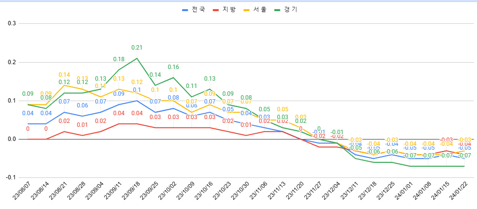 | [금요루틴] 1월 1주차 주간 아파트 매매전세동향 [한국부동산원 기준] (1) | 2024.01.05 |