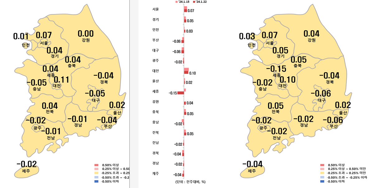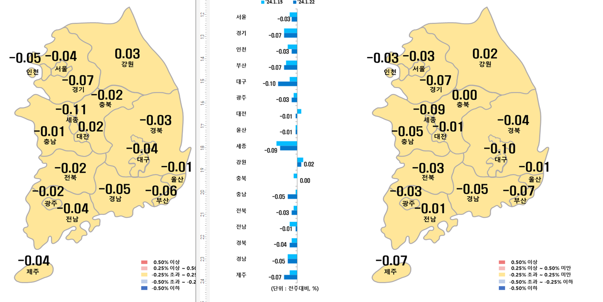 - (제주 : -0.04% → -0.07%) 지역별 혼조세 보이나, 제주시(-0.07%)는 애월·조천읍 위주로, 서귀포시(-0.04%)는 동홍동 위주로 하락