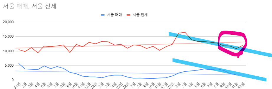 • 매매와 전세의 흐름을 좀 본건데요. 전체적인 하락장속에 서울의 경우, 현재 변곡점 혹은 특이점이 온걸지도 모르겠습니다.