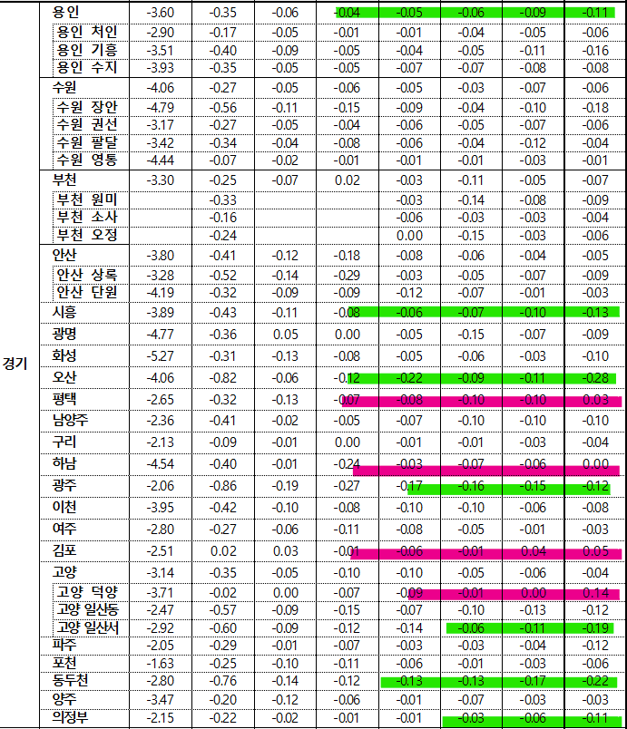 - 오산시(-0.26%)는 지곶·갈곶동 위주로, 시흥시(-0.17%)는 산현·죽율동 위주로, 성남 수정구(-0.16%)는 고등·창곡동 위주로 하락했으나, 수원 팔달구(0.38%)는 고등·매교동 주요단지 위주로, 고양 덕양구(0.28%)는 향동·관산·화정동 위주로, 고양 일산서구(0.26%)는 일산·덕이·탄현동 위주로 상승