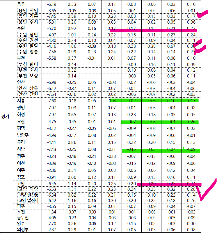 ☞ 경기는 약간 혼조세를 보이네요. GTX A 라인의 연장 호재를 가지고 있는 평택, 그리고 검단신도시까지 전철 연장 호재가 있는 김포