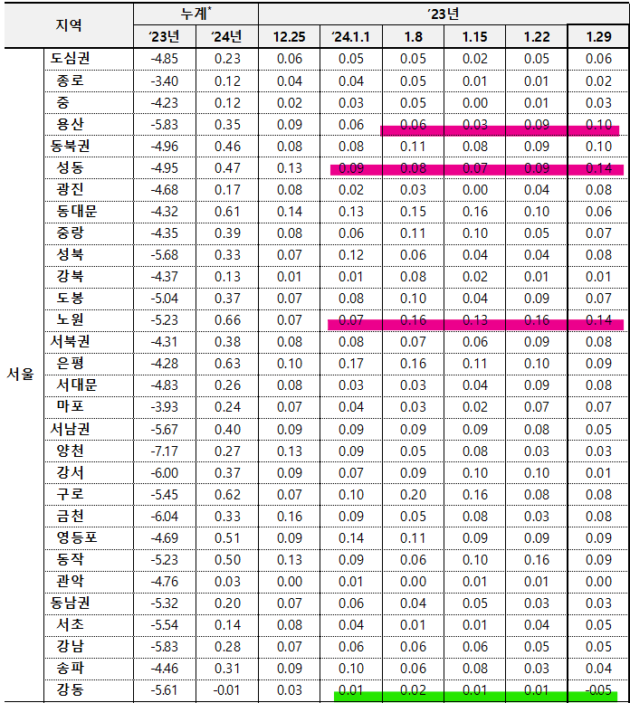 - (강북 14개구 : -0.05%) 도봉구(-0.08%)는 방학‧쌍문동 구축 위주로, 성동구(-0.08%)는 금호‧행당동 주요단지 위주로, 동대문구(-0.07%)는 장안‧전농동 위주로, 마포구(-0.06%)는 아현‧공덕동 위주로, 노원구(-0.06%)는 상계‧월계동 위주로 하락
