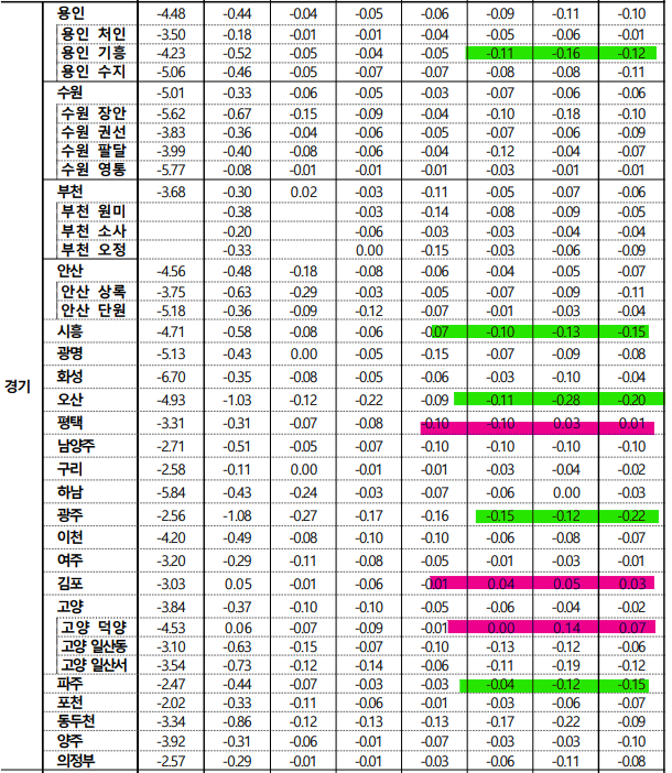 특히 광주, 파주 등지의 동북권과 오산 안성등의 남쪽 지역이 상대적으로 더 높은 하락세를 보이고 있네요.