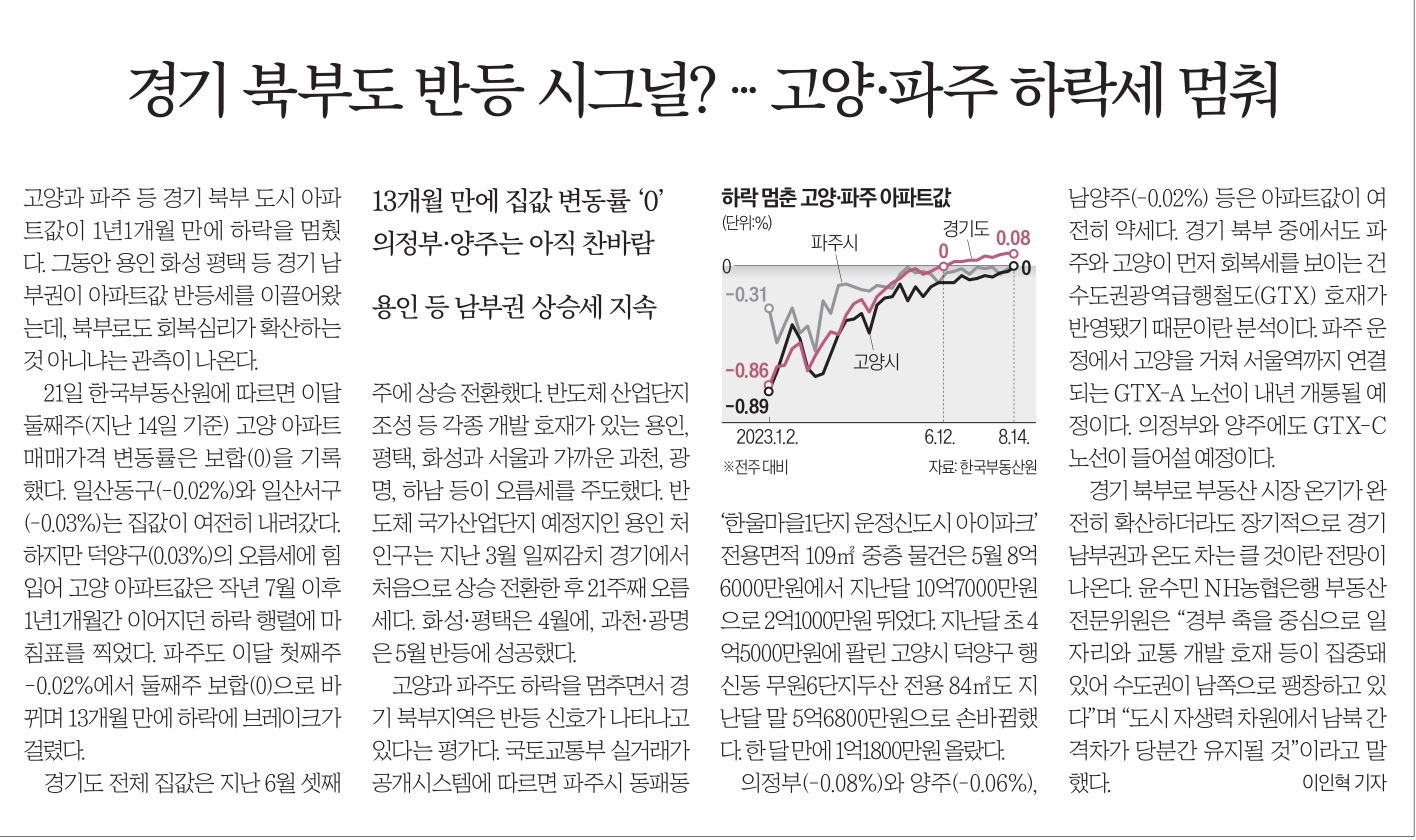 고양과 파주의 하락세가 멈췄다는 내용입니다.