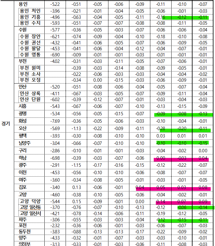 ☞ 경기도는 전체적으로 서울보다 큰 폭의 하락이지만, 지난주보다는 하락폭이 줄어들었습니다.