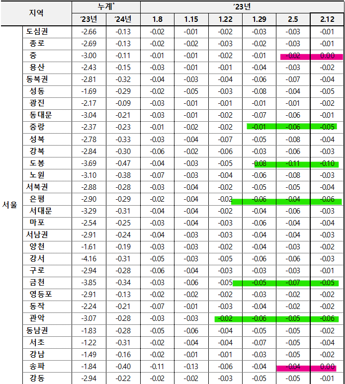 - (강북 14개구 : -0.04%) 중구(0.00%)는 단지별 혼조세 보이며 보합 전환했으나, 도봉구(-0.10%)는 방학‧도봉동 중소형 규모 위주로, 은평구(-0.06%)는 불광‧녹번동 위주로, 중랑구(-0.05%)는 신내‧상봉동 대단지 위주로, 성동구(-0.05%)는 옥수‧하왕십리동 주요단지 위주로 하락