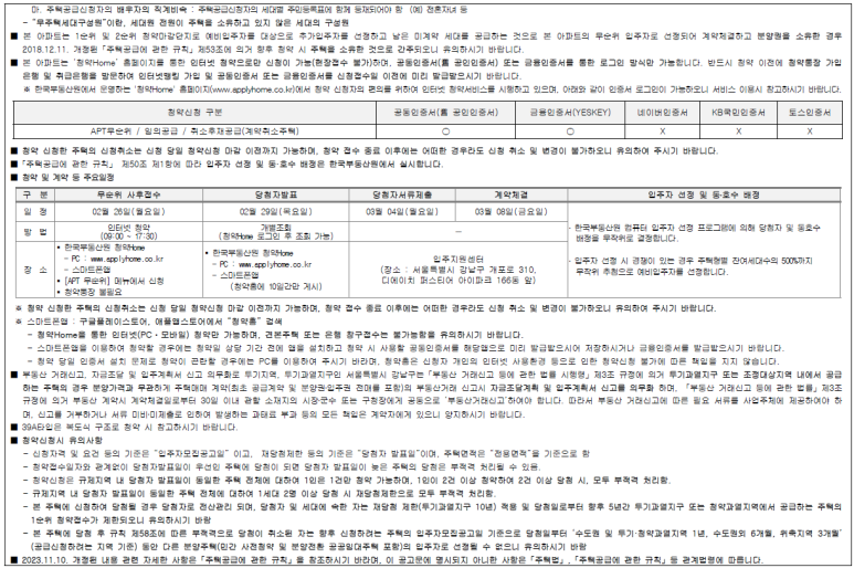 - 청약통장 가입여부와 무관하게 신청 가능하며, 청약신청금은 없음 (본인 및 세대원 중 본 주택의 당첨자 발표일 현재 재당첨제한 기간 내에 있는 경우 청약신청이 불가). 본 주택에 당첨되는 경우 재당첨 제한 적용 받으며, 부적격 당첨자로 판명 시 향후 청약하려는 지역에 따라 최대 1년간 청약신청 등 제한을 적용받음)