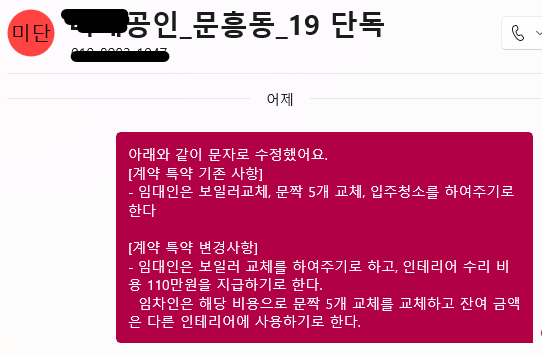 세입자 남편 : "네 안녕하세요. 반갑습니다. 다름이 아니라, 문틀 5개를 해 주기로 하셨는데, 혹시 아는 업체가 있으신건가요?"