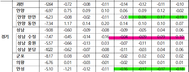 - 고양 덕양구(0.04%)는 향동‧덕은동 준신축 위주로, 여주시(0.03%)는 교통호재 영향 있는 교동 등 위주로 상승했으나, 안성시(-0.17%)는 공도읍‧대덕면 위주로, 성남 중원구(-0.16%)는 하대원‧금광동 주요단지 위주로, 시흥시(-0.15%)는 월곶‧대야동 구축 위주로, 안양 만안구(-0.14%)는 안양‧박달동 위주로, 광명시(-0.13%)는 일직‧소하동 위주로 하락