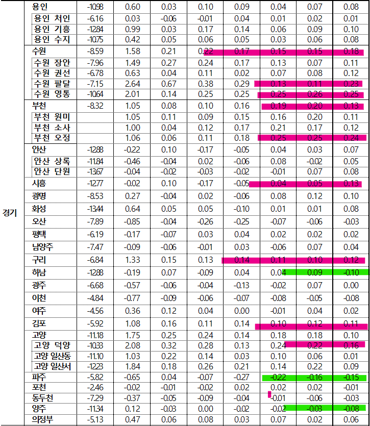 ☞ 경기도도 마찬가지네요, 선거를 앞두고 교통 호재 있는 곳. 그곳만 핀셋처럼 오르고, 다른 곳은 모두 상대적으로 큰 폭으로 하락했다는것..