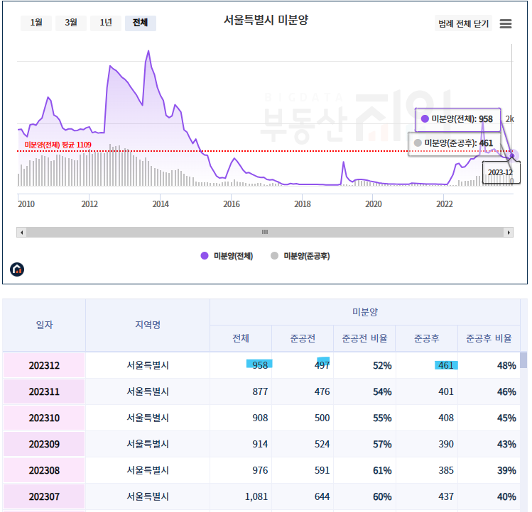 - 준공후 (악성미분양) 비율은 줄어드네?? 라고 볼 수 있지만, 준공후의 절대적인 수치는 여전히 늘어나고 있고, 전체 미분양 수치도 늘어나고 있네요.