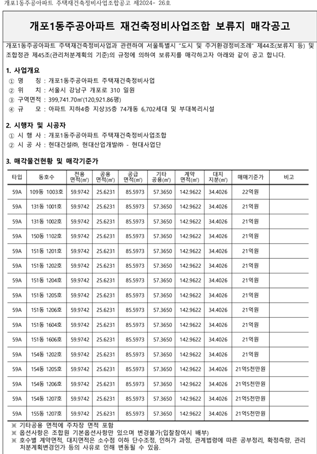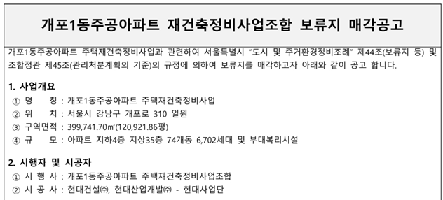 어제, 개포1동 주공아파트 재건축정비사업조합에서 보류지 매각공고가 떴습니다.
