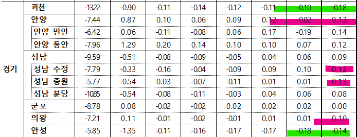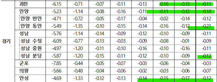 전체적으로는 과거에 많이 올랐던 지역들(과천, 오산 등)의 조정이 이루어지고 있지 않나. 생각도 들고,