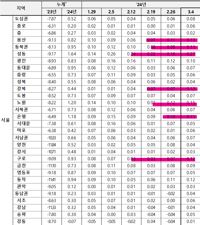 서울 전체적으로 하락하는 곳은 한군데도 없습니다.