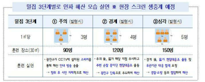 훈련 내용에 따르면 가로세로 1제곱 미터 안에 몇명이 들어가 있는지에 따라 밀집도를 분류하고 이에 따른 해산대응 기준을 만든거라고 합니다.