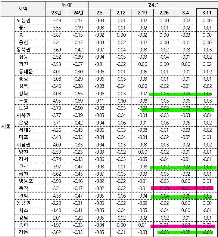 - (강북 14개구 : -0.02%) 광진구(0.02%)는 구의‧자양동 주요단지 위주로, 마포구(0.01%)는 창전‧신공덕동 위주로 상승하며 상승 전환되었으나, 강북구(-0.06%)는 수유‧우이동 위주로, 노원구(-0.04%)는 상계‧공릉동 구축 위주로 하락