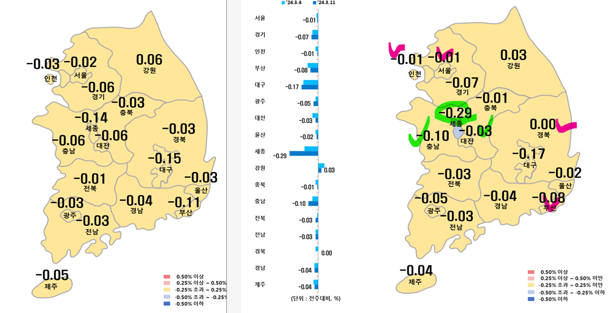 - 세종을 위시한 충청권의 하락폭이 좀 큰듯 한데, 서울의 바로미터로 보기도 했던 세종이, 이제 외따로 움직이는 것 같기도 하죠?