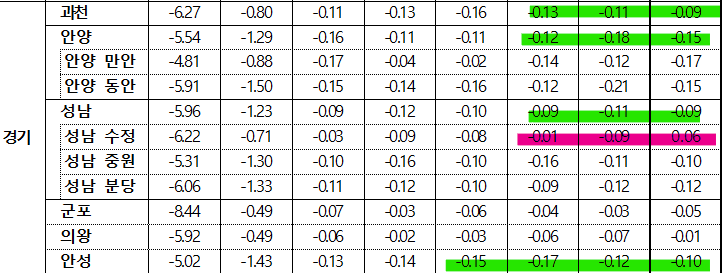 - 여주시(0.09%)는 지역 내 교통호재 있는 가운데, 정주여건 양호한 홍문‧현암동 위주로, 성남 수정구(0.06%)는 고등‧수진동 위주로, 용인 처인구(0.04%)는 개발기대감 보이며 상승했으나, 안양 만안구(-0.17%)는 안양·석수동 위주로, 광명시(-0.16%)는 광명‧하안동 위주로, 안양 동안구(-0.15%)는 평촌‧비산동 위주로, 의정부시(-0.14%)는 민락지구 및 의정부‧용현동 위주로 하락