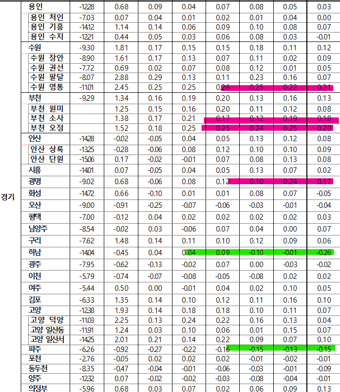- 하남시(-0.26%)는 창우‧풍산동 위주로, 파주시(-0.15%)는 검산‧다율동 위주로, 과천시(-0.11%)는 갈현‧부림동 위주로 하락했으나, 성남 중원구(0.22%)는 은행‧금광동 위주로, 수원 영통구(0.21%)는 원천‧하동 위주로, 부천 오정구(0.20%)는 여월‧오정동 주요단지 위주로 상승