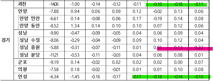 어이쿠, 하락폭이 꽤 커지고 있습니다. 전체적으로 하락 하고 있는 가운데, 여주(얘는 왜 오른걸까요??) 덕양구나 처인구 정도의 교통 호재 위주로 상승이 일어나고 있는 듯 합니다.