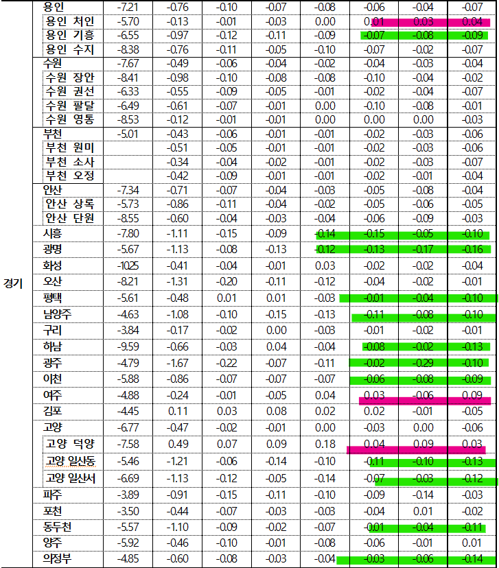 어이쿠, 하락폭이 꽤 커지고 있습니다. 전체적으로 하락 하고 있는 가운데, 여주(얘는 왜 오른걸까요??) 덕양구나 처인구 정도의 교통 호재 위주로 상승이 일어나고 있는 듯 합니다.