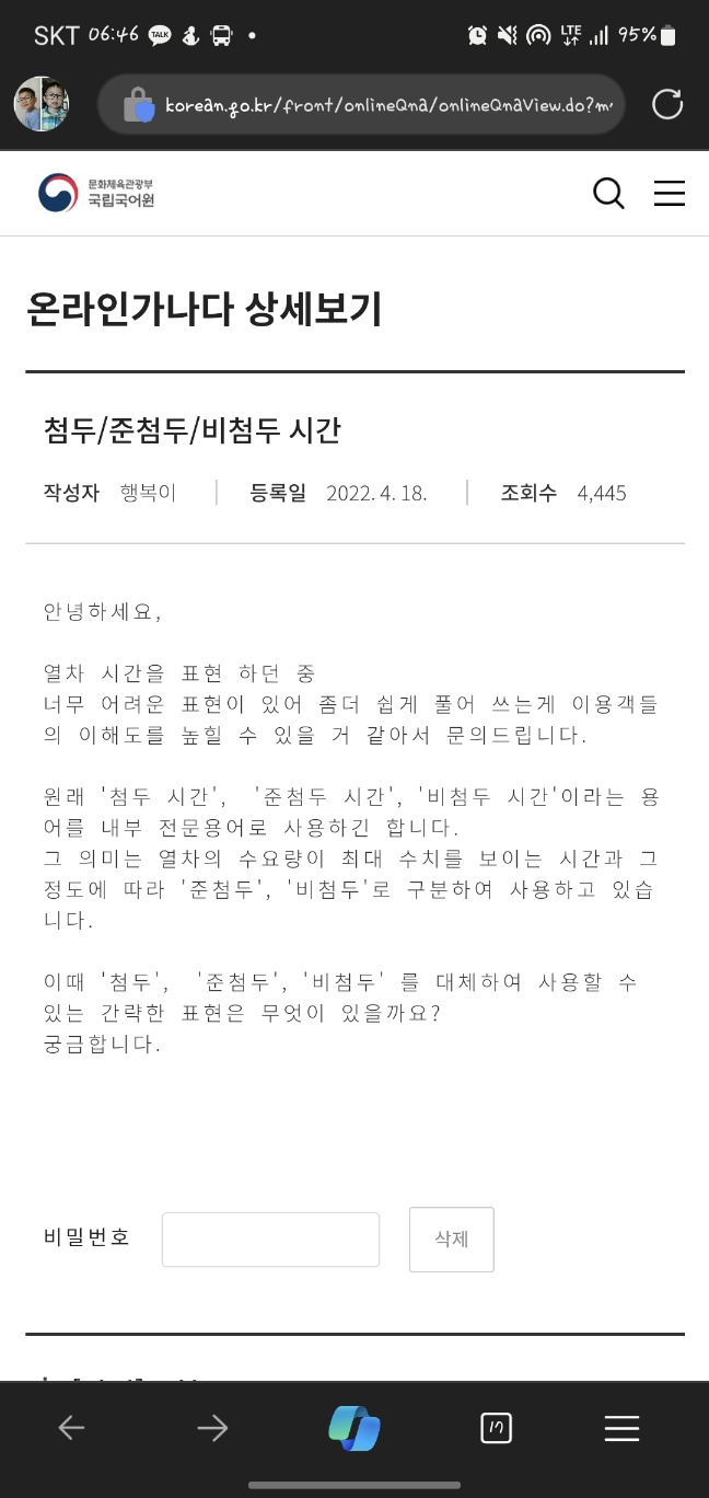 (아니, 국립국어원에서도 이렇게 이야기 하고 있는데, 관공서에서 "가장 붐빌때" 혹은 "출퇴근 시간"이라고 써 주면 안됩니까??ㅎㅎ"