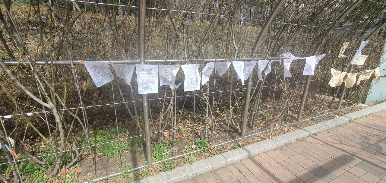 법원 앞에 많은 사연들이 붙어 있습니다.